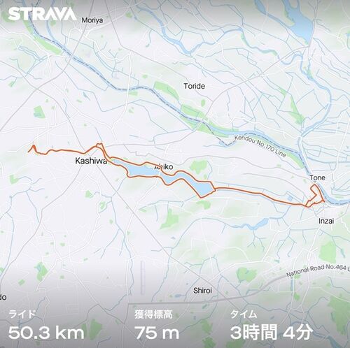 手賀沼の周りを通るようなルートで利根川までの往復です。 総距離は48.4kmってことで、過去最高ぐらいの距離でしたがペースを抑えたので後半でそんなに疲れなかった。 まぁそれでも、疲れないってことじゃないので…