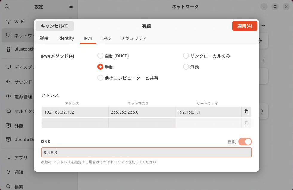 2025-10-17 録画サーバーのIPアドレス 録画サーバー Ubuntu HDCPからの自動取得でIPアドレスがコロコロ変わるとやっかいそうなので… 固定にしておきます。GUIで設定からネットワークでIPv4の項目を変更します。 再起動して動作確認です。
